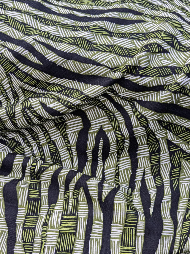 Beautifully soft with all the drape. This viscose jersey has a black background with bamboo stripes in shades of green.
