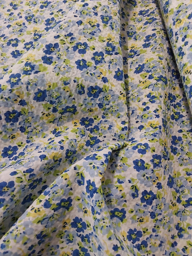A beautiful ex high end designer deadstock fabric - our spring garden seersucker is crafted from 100% cotton. This lightweight fabric features a delicate scattered floral design in soft blues, fresh greens, and hints of yellow on a pale background, evoking a classic springtime garden feel.