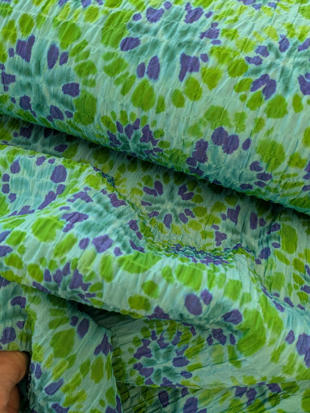 This vibrant crinkle fabric features a fresh green tie-dye effect with a beautifully textured, puckered surface that adds depth and movement to any garment. Lightweight yet durable, it combines the practicality of polyester with a touch of Lycra for gentle stretch and added comfort.