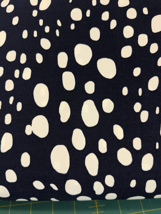 This fabric is a lightweight viscose jersey with a deep navy base and playful irregular white spots. Soft and breathable with a beautiful drape, it has excellent stretch and recovery, making it both comfortable and practical to wear. Perfect for dresses, tops, skirts, and loungewear, this fabric combines effortless style with everyday ease.