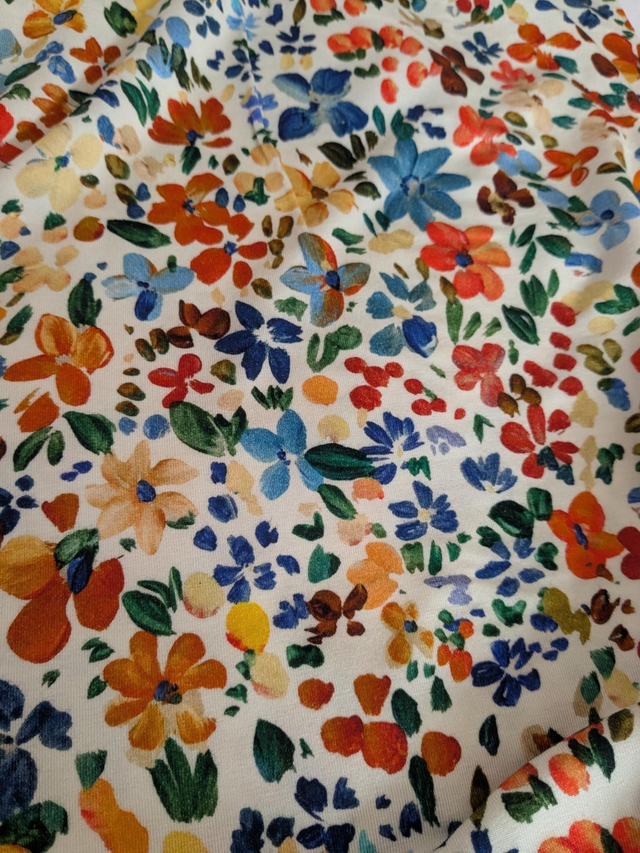 This is a gorgeous viscose jersey with a painterly floral design on an ivory background. It is buttery soft with a fluid drape.