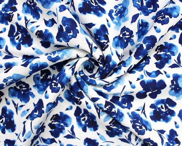 This is a gorgeous viscose/linen blend from Little Johnny Fabrics. It features a blue painted flower design on white background. Perfect for summer it is soft with beautiful drape.
