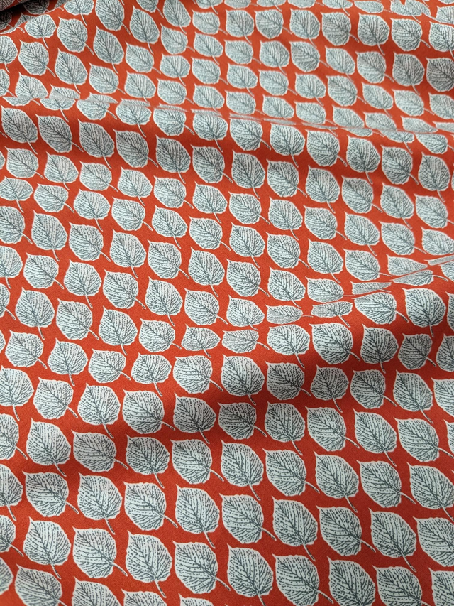 Beautiful quality Pima Cotton Lawn. Autumnal Orange background with a grey leaf print.