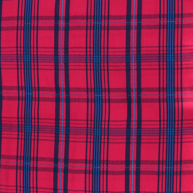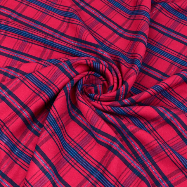 Cotton Viscose blend fabric. It is a rich red coloured background with a check design in royal blue with a touch of lurex sparkle. Perfect for your seasonal sewing.