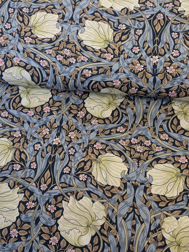 £8.00 per metre. This viscose challis is so soft and very pretty with a William Morris - esque floral design. Composition: 100% viscose Weight: light Width: 140 cm Good for dresses, skirts, blouses, tops, pjs